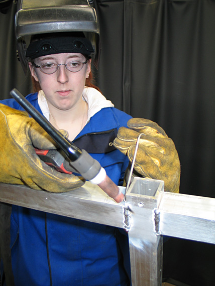 Anne Baller schweißt den Aluminiumrahmen für eine der vier Türen des Labors.